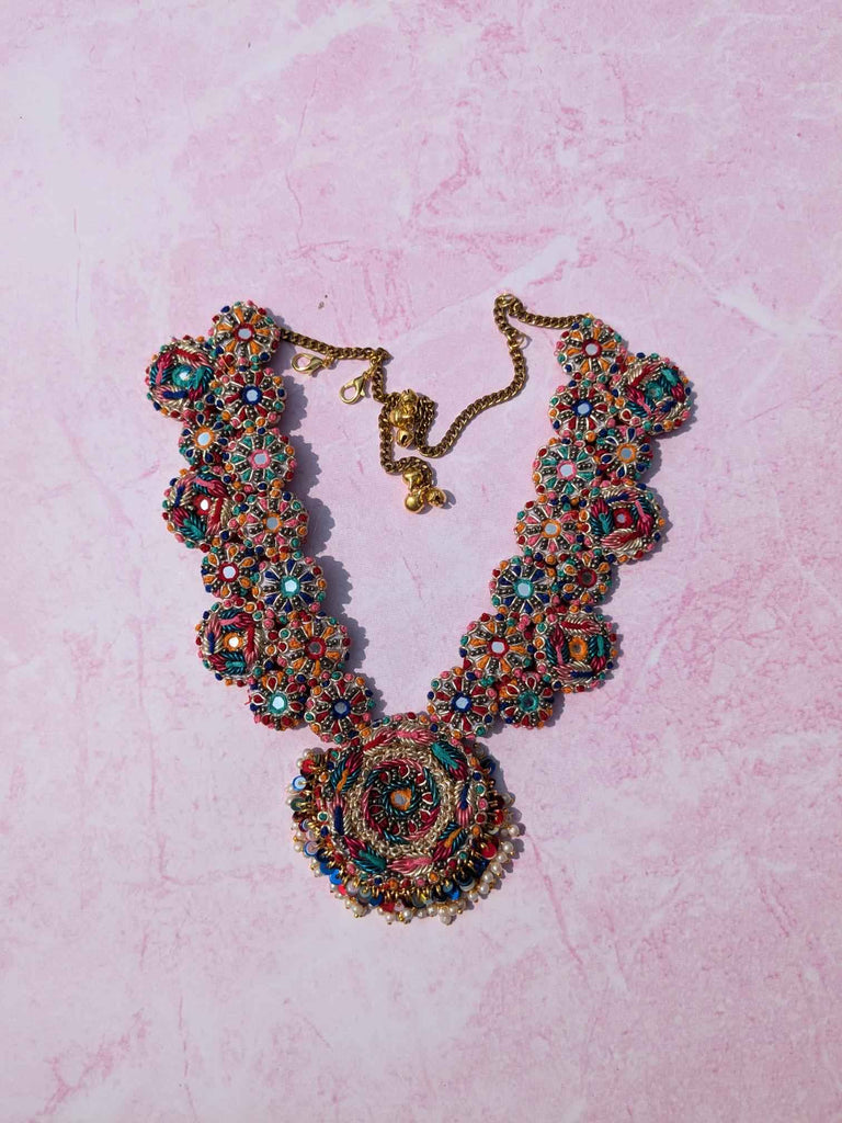 Each piece is meticulously crafted using intricate hand embroidery techniques on a textile base.