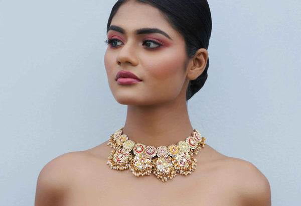 This stunning choker strikes a perfect balance between tradition and Contemporary elegance. Its radiant round base is adorned with intricate ghungroo detailing that adds sound and sparkle, making it a striking accessory for festive and...