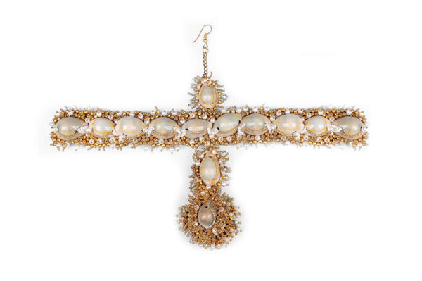 Featuringa gold & white finish Haathful studded with pearls ,Shells,chid in set.