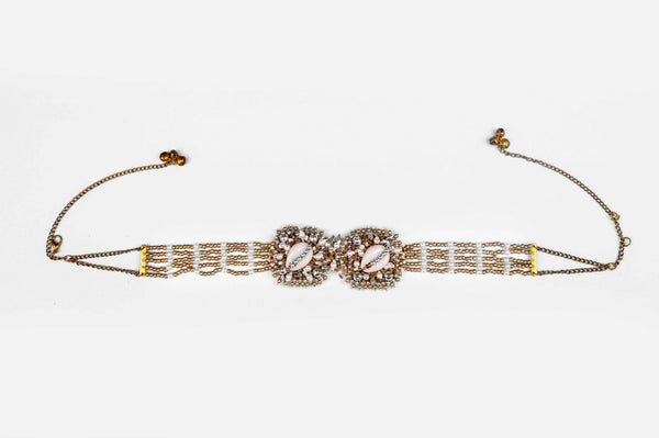 Featuringa gold & white finish mathapatti studded with pearls ,Shells,chid in set.