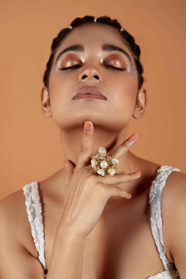 Featuringa gold & white finish Ringss studded with pearls ,Shells,chid in set.