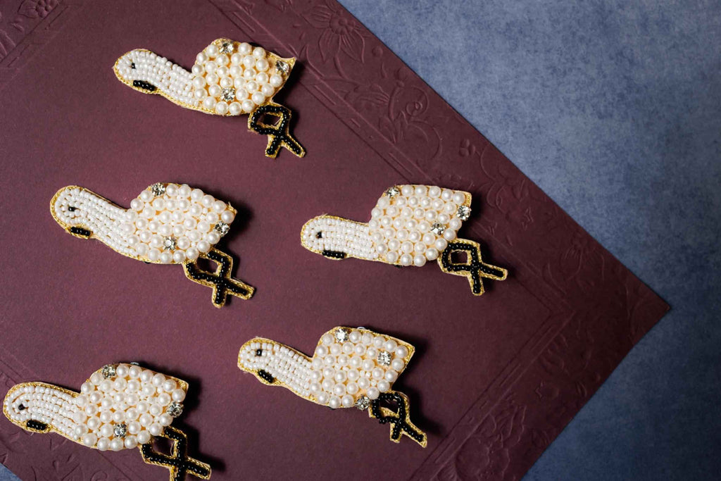 Each piece is meticulously crafted using intricate hand embroidery techniques on a textile base.