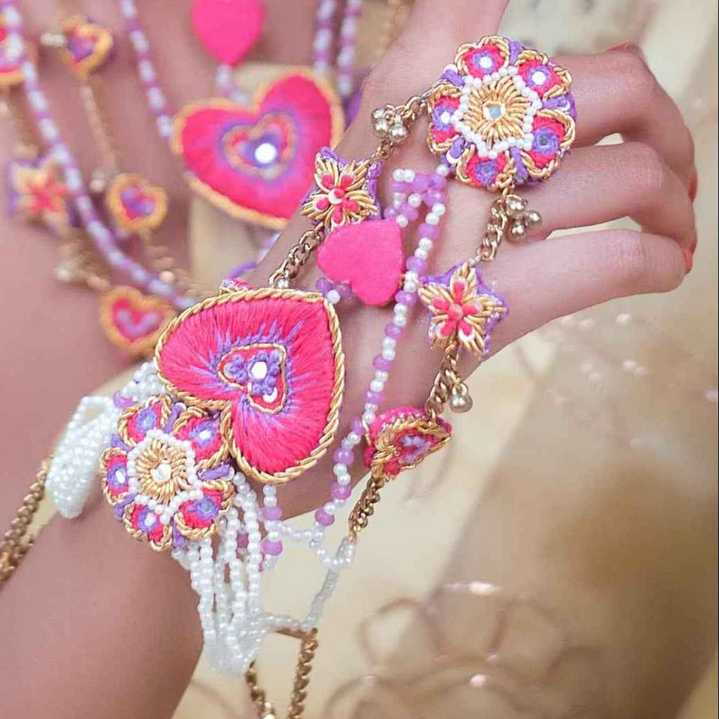 Each piece is meticulously crafted using intricate hand embroidery techniques on a textile base.
