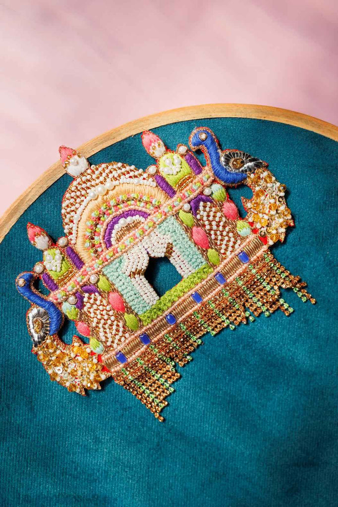 Each piece is meticulously crafted using intricate hand embroidery techniques on a textile base.