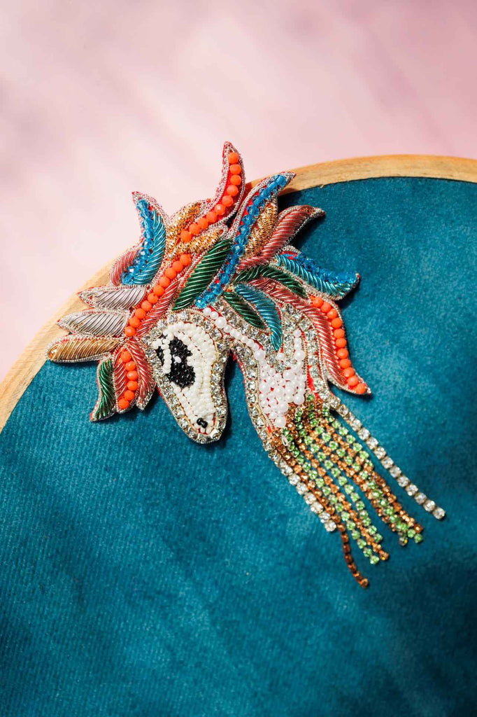 Each piece is meticulously crafted using intricate hand embroidery techniques on a textile base.