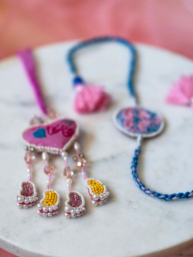 Each piece is meticulously crafted using intricate hand embroidery techniques on a textile base.