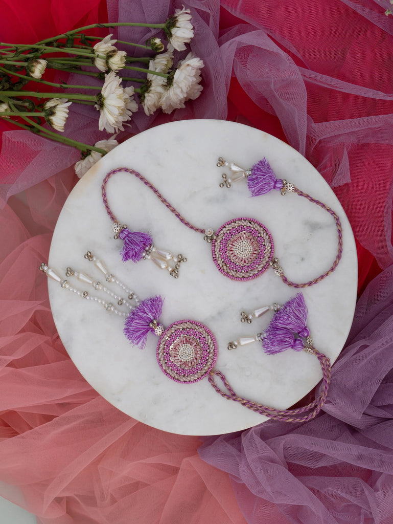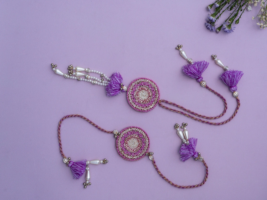 Each piece is meticulously crafted using intricate hand embroidery techniques on a textile base.
