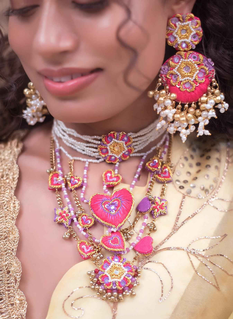 Each piece is meticulously crafted using intricate hand embroidery techniques on a textile base.
